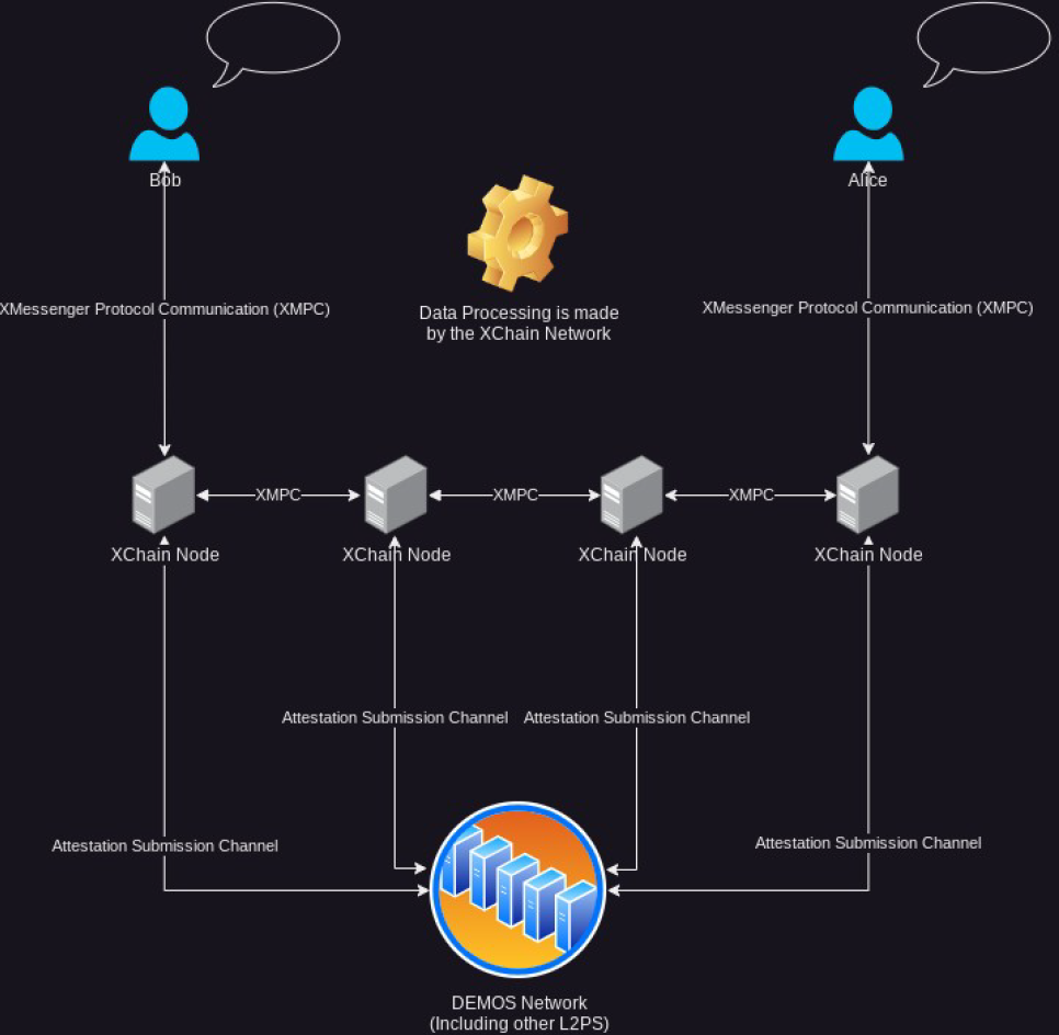 XChain nodes, as shown in Figure 2, are directly connected with each other. Nevertheless, each XChain node is also participating in the DEMOS Network, effectively serving as a DEMOS L1 node.&#x20;